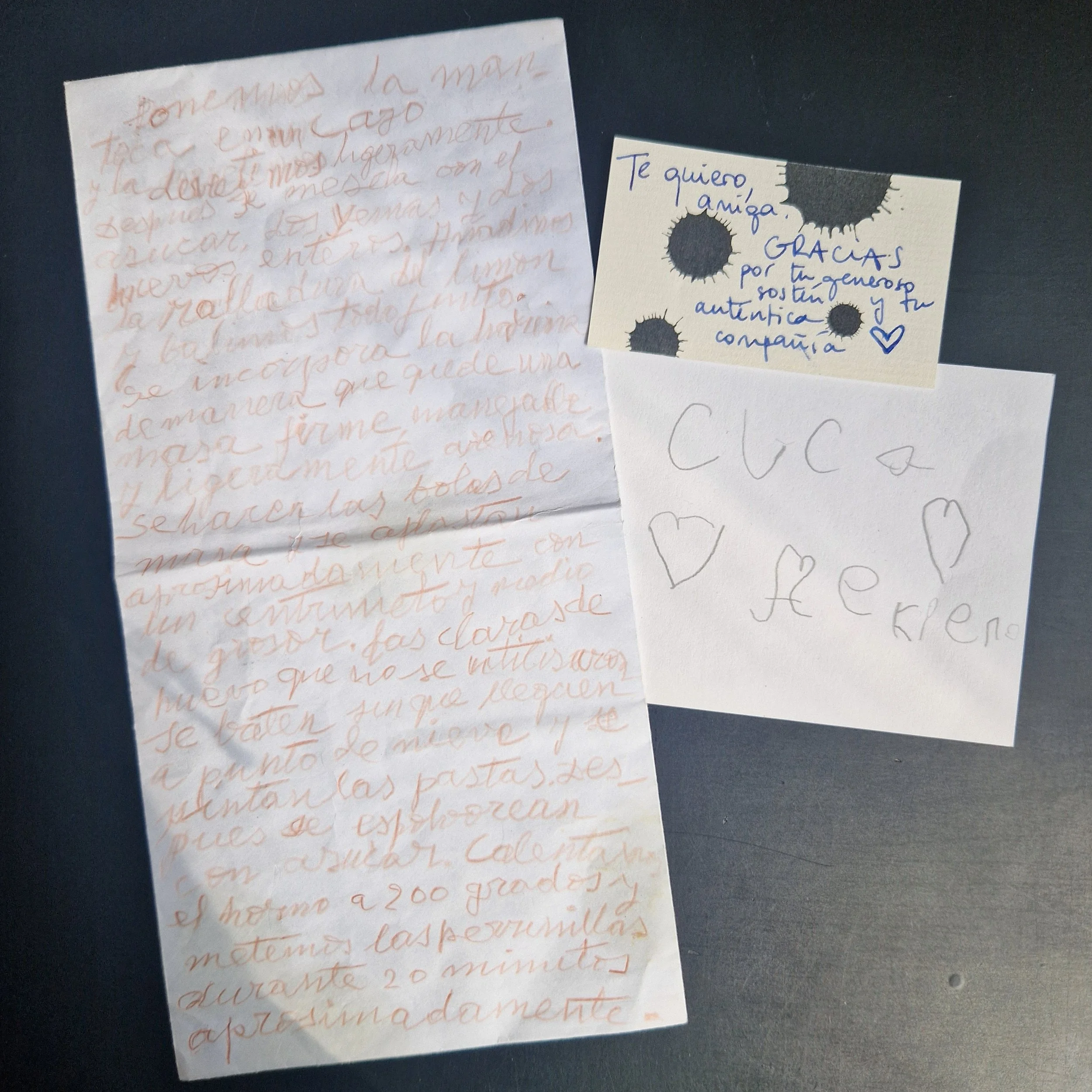 Cuidar escribiendo también puede significar mantener vivo el recuerdo de los ausentes. Copiar sus recetas, sus frases, su letra. Mantener vivo un rastro en el tiempo. En ese gesto hay algo más que memoria: hay vínculo. Como sostiene Luigina Mortari, cuidar es una forma de amar que reconoce la vulnerabilidad del otro. Y pocas cosas son tan humanas y vulnerables como una letra temblorosa que se atreve a decir: “te recuerdo”, “te pienso”, “te cuido”.